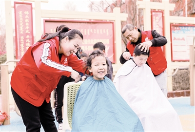 3月14日,呼和浩特市玉泉区清泉街社区的志愿者在为小朋友理发。当日正值农历二月初二,我国民间有“二月二,龙抬头”的说法和剃头理发的习俗,该社区居民举办了爱心义剪、吃龙须面、展示精美服饰等丰富多彩的民俗活动,欢度“二月二”。