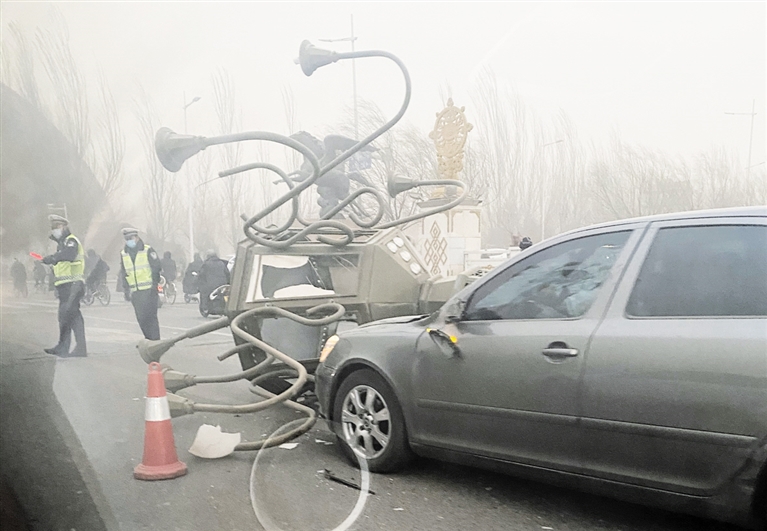 目击者航先生告诉记者,7时20分左右,他去包钢厂区上班时途经事故现场。只见昆河中桥南侧的路灯杆被大风刮倒,整个路灯杆斜倒在桥面的马路上,一辆灰色斯柯达明锐轿车车头被砸,打着双闪停在路中间。河西交管大队的几名交警正在大风中疏导交通并侦查事故现场。