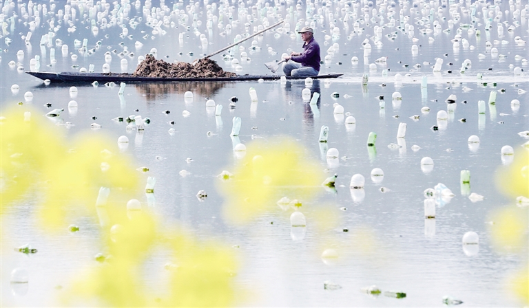 3月14日,水产养殖户在珍珠蚌养殖基地水面上作业。时下,浙江省湖州市德清县新安镇水产养殖户清理鱼塘、喂食鲈鱼、分殖珍珠蚌,投入忙碌的“水上田园”劳作中。摄影/谢尚国