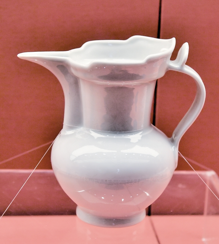 束颈、鼓腹、圈足、曲柄,白釉质地,壶口形似僧帽。