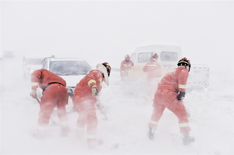 3月15日,受大风及雨雪天气的影响,呼伦贝尔市海拉尔区至新巴尔虎左旗201省道莫达木吉服务区附近积雪堆积,公路形成长达3公里的“梗阻”,大风卷起漫天飞雪,部分车辆人员被困。接到报警后,呼伦贝尔市消防救援支队紧急调派6车28人前往救援。救援人员在铲车配合下,从“梗阻”路段的一端着手,一步步打通“生命通道”,成功解救被困车辆36辆,被困人员110人。摄影/候 诣