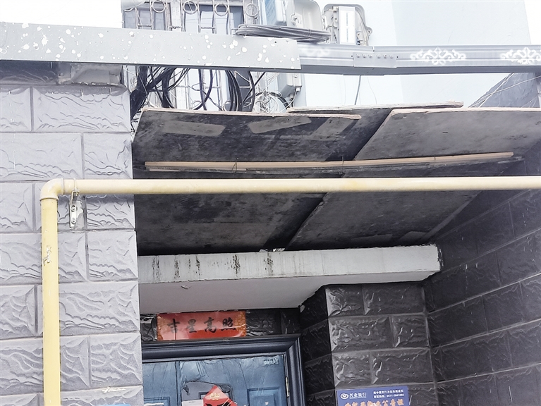 3月15日下午,记者来到新城区爱民街爱民小区2号院。记者发现,5号楼共6层,6楼顶房檐贴的瓷砖及水泥已经有部分脱落,脱落的瓷砖及水泥就落在5号楼几个单元的门口,掉在地上摔得粉碎,如果砸在人头上后果不堪设想。在5号楼2单元的楼道口,居民为了自身安全,用木板临时搭个了“防护棚”,以免居民出入时被砸伤。5号楼的一位居民告诉记者,3月11日,下了一场雨,6楼房檐的瓷砖和水泥便开始掉落,这两天风大,瓷砖和水泥掉落的面积也越来越大,越来越多,砸中人的几率在加大。这几天,居民们出入时都提心吊胆的。居民们也向物业及相关部门反映过此事,但至今没人管。