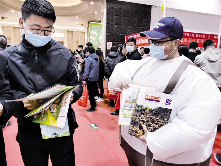 记者跟随人流走进展厅,“南瓜籽极具保健功能,这种南瓜籽是杂交育成的籽用南瓜综合品种,外观雪白光滑,颗粒饱满。”“给你,拿一份宣传册,了解一下来自辽宁的苗木品种,欢迎前来参观洽谈。”……参展企业在大厅入口两侧积极踊跃地向参观者发放各自的宣传册,并不时向大家介绍着特色产品,还不忘推荐自家产品二维码进行详细了解。为了引起人们的注意,有的企业让销售人员扮成卡通人物或头上戴着“我卖老鼠药”搞怪发饰,这种与众不同的宣传效果十分明显。一个身着“大白”装扮的工作人员不一会儿就将手里的资料发放完毕,面对镜头还摆出胜利的手势。