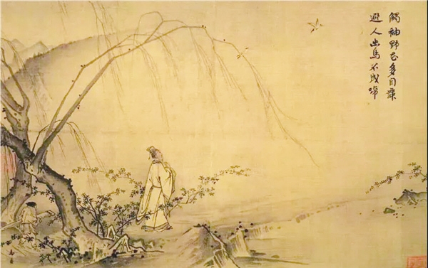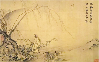 《山径春行图》为边角之景,绘春日漫步山径的怡然之乐。此画尺幅较小,却留下大片空白,突出了画家经营位置之高明,马远通过以虚写实,疏密而量的手法,将远处之景笼罩于迷雾之中,似有“暖涨一川春雾绿。白凤徘徊清淑。似沉水无烟,礜汤千斛”之感,空白之处反而为画面增添了不少诗意。画中的主人公,悠然自得,缓步而行,若临春风。