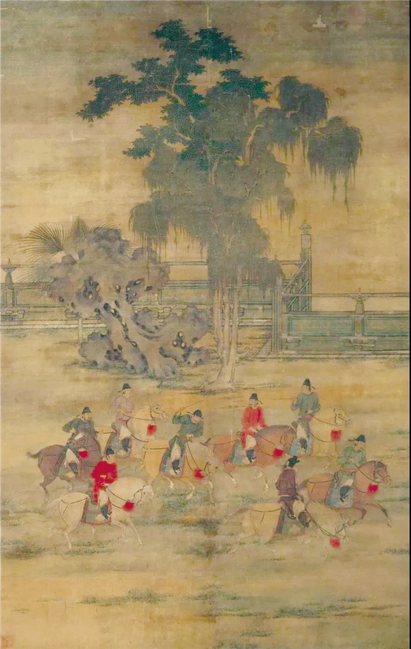 《春游晚归图》中绘一男性官员春游回府,前后簇拥着10名侍从,他们或搬椅、或扛兀、或挑担、或牵马,一片晚归时的欣然场景。官员持鞭回首,仿佛意犹未尽,表现出南宋官僚安于江南时的悠闲生活,令人想起南宋林升《题临安邸》一诗:
