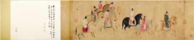 《虢国夫人游春图》描绘了天宝年间唐玄宗宠妃杨玉环的姐姐虢国夫人和秦国夫人携其侍从春游的场景。