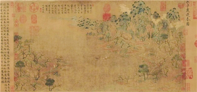 展子虔的《游春图》上并无作者的名款和印章,也无图名,因宋徽宗赵佶在隔水处题有“展子虔游春图”而得名。