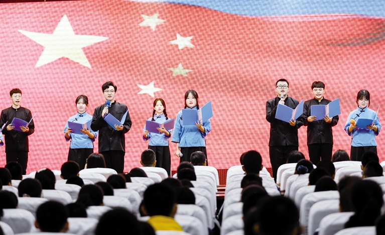 来自呼和浩特市第三十八中的20多名同学,身着民国风服装,为大家朗诵了《少年中国说》:“少年自由则国自由,少年独立则国独立,少年进步则国进步……”雄壮的合声朗诵不绝于耳,将现场观众带入了衣袂飘飘、文采风流的年代,展现了一代中华青年追求国家独立自由富强的不懈努力。