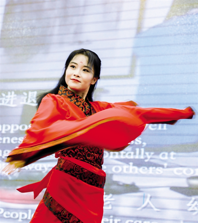 本次活动在开场舞《礼仪之邦》中拉开帷幕,来自内蒙古经贸学校旅游服务与管理专业(航空方向)二年级的侯文静同学,身着一袭红色汉服,在舞蹈中融入作揖、拱手、鞠躬等中华传统礼仪,配合着大屏幕播放的古典视频和音乐,让现场观众仿佛穿越到了汉唐。