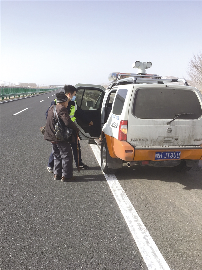 2021年2月,总队七支队三大队执法人员执行道路巡查任务期间,发现G1013海张高速上有一位老人徘徊在高速公路超车道上,由于正值春运返程高峰,车流较多,情况十分危险。考虑老人年事已高,天气寒冷,执法人员将老人搀扶到执法车内。经了解,老人已经九十三岁高龄,此次出行是为了赶往正蓝旗哈毕日嘎镇办事,误入高速公路。执法人员向老人讲解高速公路封闭管理相关规定,并且安抚老人让他不要担心,由于老人行动不便且听力减退,交流困难,执法人员将老人送至派出所,由派出所民警联系老人的子女。与执法人员告别时,老人握着执法人员的手连声道谢。