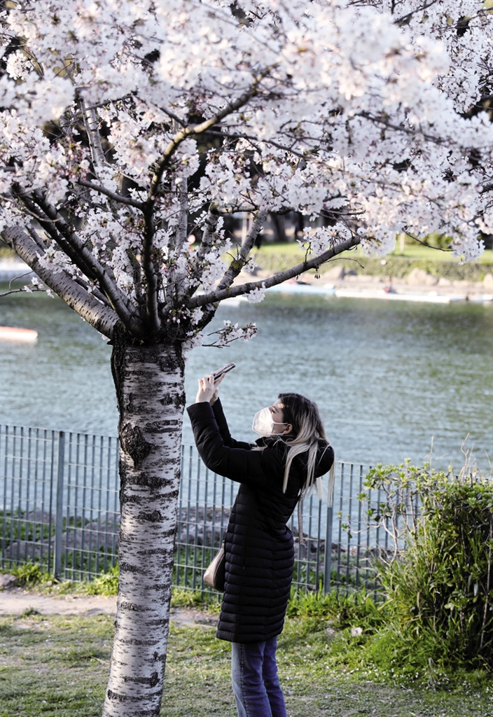 3月24日,佩戴口罩出行的市民在意大利首都罗马一株盛开的樱花树下拍照。罗马目前天气转暖,春意浓浓。由于新一波疫情影响,包括罗马在内的意大利多数地区正处于疫情防控最高等级的红色区域,实施“封城”措施。 摄影/新华社记者 程婷婷