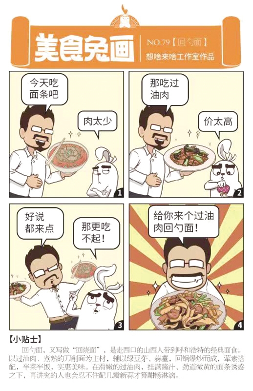 回勺面,又称“回烧面”,是走西口的山西人带到呼和浩特的经典面食。以过油肉、煮熟的刀削面为主材,辅以绿豆芽、蒜薹回锅爆炒而成,荤素搭配,半菜半饭,实惠美味。在滑嫩的过油肉,挂满酱汁、劲道微黄的面条诱惑之下,再讲究的人也会忍不住配几瓣新蒜才会吃的酣畅淋漓。