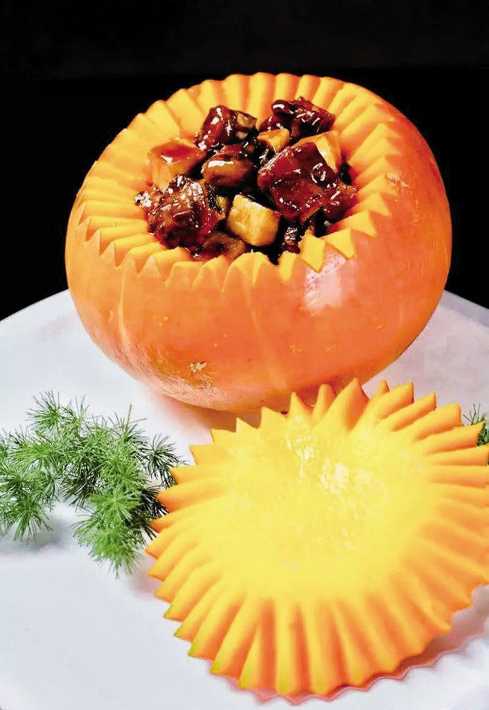 6.将腌制好的猪肋排连同酱汁放入南瓜盅内,再蒸20分钟即成。文/小 易