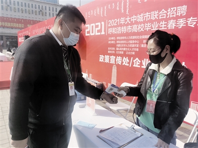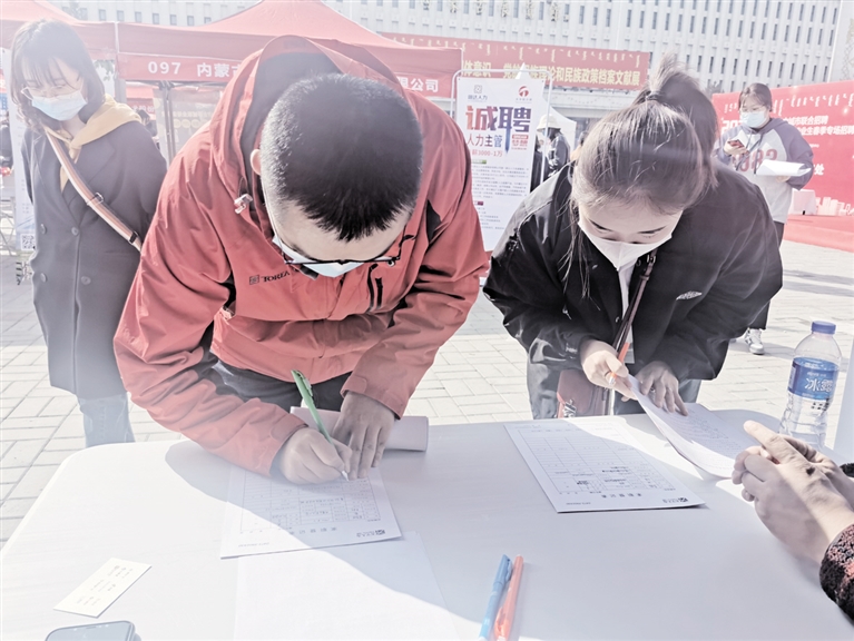 在一家招聘企业展台前,今年即将毕业的大学生张海啸一边填写求职登记表,一边询问相关情况。谈到薪资待遇,他告诉记者:“我在包头科技大学读的建筑电器与智能化专业,毕业后我想找一份建筑类行业的工作。由于刚毕业,我希望工资能在4000元左右,有五险一金,节假日能正常休息的工作,有了生活保障,才能更好投入工作。”