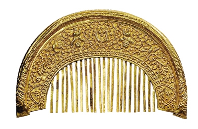 现代梳子用材通常比较便宜,古代梳子可以当作发卡用,有装饰功能,偶尔也会用到一些昂贵材料。2017年6月,中国嘉德上拍了一把明缠枝叶花卉纹金梳,最终以25.3万元成交。此梳长12.5厘米,重90.7克,梳背为虹桥式装饰带,与梳篦部分为一体,整体系金片打制而成,连珠纹组成边框,主纹饰为缠枝卷草,弯拱处为两个颈戴项圈对舞的童子及两只对飞的禽鸟。古代金银打制的梳子数量不是很多,更多的是梳背与梳篦质地不同而分别制作,然后套合一起,此件梳背与梳篦同样采用纯金材质,非常珍贵。