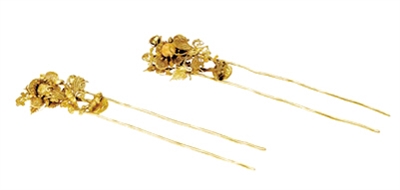 明清时期,钗头常见一种特殊工艺,名为“累丝”,就是将金银拉成丝,然后将其编成辫股或各种网状组织,再焊接于器物之上。累丝不仅使首饰的立体造型或繁复的构图用材大为俭省,也让金银本身变得柔和轻盈,精光内敛,丰富了首饰图案的表现。2016年5月,中贸圣佳上拍了一对清金累丝蝶恋花对钗,最终以4.6万元成交。此对金钗单个长11.5厘米,造型生动,制作工艺精巧。钗脚用窄金条绕成一道弯梁,形制对称,钗首是素边丝掐出各个小件的轮廓:凤蝶、花片,叶子,然后分别攒焊、镶嵌为一个一个小件。恰如采花一刻,凤蝶轻轻落起在花瓣上突显姿态柔美,犹显蝶恋花吉祥寓意。