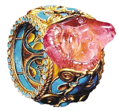 眼下拍卖会上现代工艺的宝石戒指很多,但古代戒指难得一见,一旦出现总能引起关注。2014年5月,中国嘉德上拍了一只清代金质点翠蝙蝠纹、连钱纹嵌碧玺绵羊头戒指,最终以18.4万元成交。该戒指外直径3.07厘米,高3.3厘米,重约42克。戒面为一粉红碧玺质地的大绵羊首,羊角下卷,羊耳微垂,圆目大睁,口鼻微张,羊首两侧以点翠蝙蝠相簇,金翠相衬,灵巧可人。指圈内侧仍有点翠连钱纹装饰,里外如一,奢华内敛,贵气逼人。