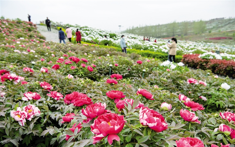 3月30日,游人在朱鹮梨园景区的牡丹园赏花。近日,陕西省汉中市洋县朱鹮梨园景区的万亩牡丹园里,200多个品种的牡丹竞相开放,形成“龙凤呈祥 花开富贵”的吉祥图案,令游客流连忘返。