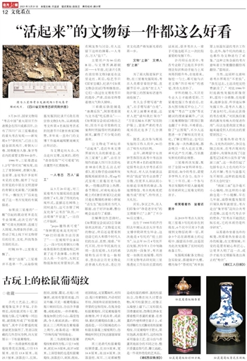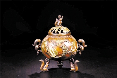 其三是清代松鼠葡萄纹铜香薰,长22.5厘米,宽16.8厘米,高22.8厘米。该器盖纽、双耳、三足都被塑造成松鼠的模样。盖纽松鼠站立,仿佛在向人讨要食物;双耳松鼠倒立,好像正从墙壁上溜下;三足松鼠头顶香薰底部,仿佛在拼命支撑着整只香薰的重量。在香薰的外壁和镂空盖子上,采用浮雕的方式雕刻有松鼠葡萄纹。只见葡萄叶子肥大,果实饱满,松鼠乖巧。这些纹饰采用鎏金工艺,显示出与香薰其他部分的不同之处。整只香薰造型巧思,雕工高超,是一件美妙绝伦的艺术品。