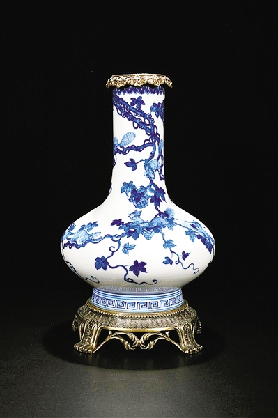 其一为清康熙松鼠葡萄纹青花长颈瓶,口径5.5厘米,底径13.8厘米,高25.7厘米。该器直口,长颈,削肩,鼓腹,圈足,在瓶口有镶嵌,底部有银质底座,四足外撇。只见一根葡萄藤从瓶口倾斜而出,分出许多藤蔓,或粗或细,一串串葡萄,堆垒如倒立的小山,晶莹饱满,令人垂涎欲滴;一群松鼠正三三两两地在葡萄藤上爬行,准备将这一颗颗“珍珠玛瑙”悄悄偷走。