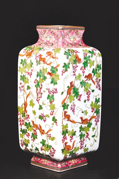 其二为清乾隆松鼠葡萄纹粉彩四方瓶,口长7.8厘米,底长10.5厘米,高27.8厘米,上面绘制的也是松鼠葡萄纹。该器直口,束颈,削肩,底部收起,足呈覆碗形,有四边。瓶口有紫铜纹,外沿有回形纹,颈部和足部装饰粉色背景的宝相花纹,在瓶身绘松鼠葡萄纹。只见葡萄藤弯曲缠绕,叶子或淡青,或浓绿,紫红的葡萄挂在藤上,剔透晶莹,一只只棕褐色的小松鼠在藤蔓上缓缓爬行,仿佛能听到它们发出窸窸窣窣的响声。