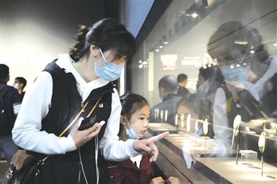 4月4日,参观者在三星堆博物馆内参观。近来,受三星堆遗址考古重要发现影响,四川省广汉市三星堆博物馆访客量迎来大幅增长。清明小长假期间,三星堆博物馆所有展馆向公众开放,博物馆游客中心及展馆前都排起长龙。摄影/新华社记者 刘梦琪