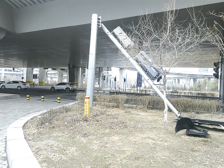 当日上午,记者来到该路口,发现东南西北各个方向的红绿灯全部不亮,车辆、行人通行时均小心翼翼。而在道路中间,散落着一些车辆碎片,很明显,这里不久前发生了一起交通事故。在十字路口的东北角,一组红绿灯的灯杆被拦腰撞断。