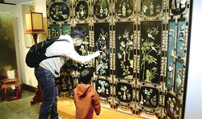 4月5日,观众在参观金漆镶嵌技艺作品。当日,国家级非物质文化遗产金漆镶嵌技艺系列活动之匠心漆韵——金漆镶嵌技艺精品展在北京开幕。展览展出了30多件高品质漆艺精品和百余件金漆镶嵌文化创意作品,涵盖镶嵌、彩绘、雕填、刻灰、断纹等众多工艺门类,展示了中华优秀文化的传承。