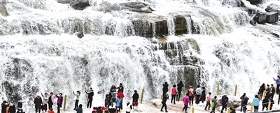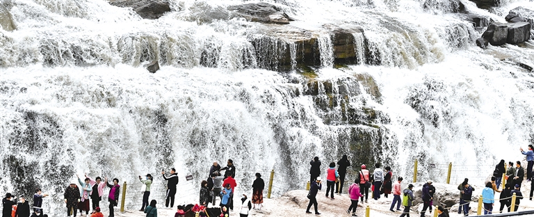 4月13日,游人在陕西壶口瀑布景区游览。近日,随着黄河上游冰凌消融,位于秦晋峡谷的黄河壶口瀑布水量增大。游人纷纷前来观看“一里壶口十里雷,春水腾雾浪滔天”的壮观景象。摄影/新华社记者 陶 明