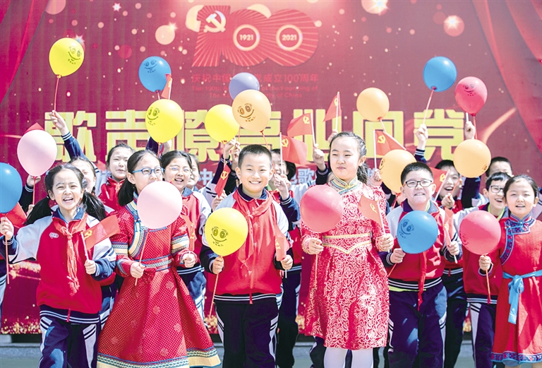 4月19日,第四中学小学部的学生们演唱《同在国旗下》。当日,为了庆祝中国共产党成立100周年,传承红色基因,丰富校园文化生活,呼和浩特市教育局启动“歌声嘹亮心向党”呼和浩特市教育系统中小学生红色歌曲接力传唱活动。活动从市直属学校启动,将辐射带动全市百所学校的师生共同参与接力传唱。