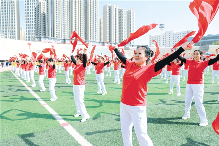 4月20日,首府健身爱好者跳起快乐的健身操。当日,由呼和浩特市体育局、呼和浩特市体育总会主办的呼和浩特市五个一万工程系列活动暨第十六届广场操、太极拳展演活动在呼和浩特市人民体育场举行,来自首府的2500余名健身爱好者进行了多个项目的展演。本次活动旨在吸引更多的群众参与到全民健身活动中来,引导大家在运动中享受乐趣、增强体质。摄影/北方新报正北方网记者 牛天甲