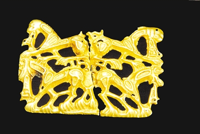 该窖藏出土的动物形金饰牌、金饰件与拓跋鲜卑金饰牌的风格接近。工艺上,单体动物采用铸造、圆雕、镶嵌工艺,立体感极强。群体动物以同种动物两两相背、上下排列为组合,采用透雕工艺,并结合浮雕,具有很强的装饰效果。