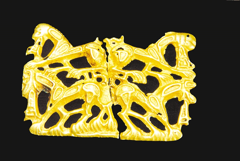 “其中有一件四兽纹金饰牌的背面刻有‘猗 * 金’三字,这三个字明确了这批重要文物的归属。猗 * 金三字中的‘猗 * ’,指的是拓跋鲜卑的领袖人物猗 * 、猗卢兄弟二人中的猗 * 。他于西晋末年助并州刺史司马腾打击刘渊有功,西晋王朝授以金印、银印及黄金饰物的赏赐品,这批文物正是拓跋鲜卑猗 *部的遗物。凉城县小坝子滩正是当时‘居代郡参合坡北’猗 *部的属地,这也与《魏书·序纪》记载的史实相吻合。”丁勇说。