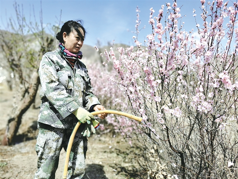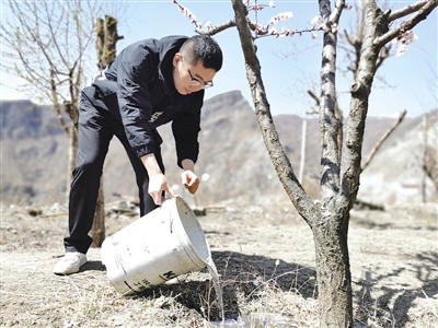 看了今年要植树的新区域后,记者又驱车驶向山顶,到了前几年北方新报读者林植树的最高区域。映入记者眼帘的,不仅有苍翠挺拔的樟子松、油松,还有竞相绽放的杏花、山桃花,一派春意盎然的景象。此时,工人们正在对树木进行剪枝,有的工人则将水管拉到树坑中浇水。马国安说,苗木种植完成后,离不开坚守在山上的护绿队,正是有了他们的日常养护,树木的成活率才能普遍达到95%以上。为了提高树木的生长速度,他们从两公里以外的水库引入水源,定期对树木进行浇灌,只要有树的地方,几乎都有长长的水管和正在旋转喷水的喷淋设备在浇灌。