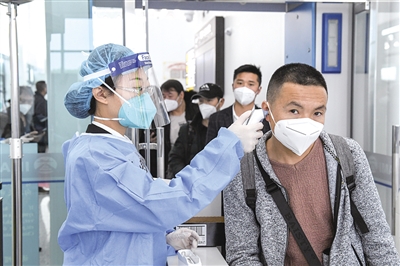 4月26日,在呼和浩特白塔国际机场国际航站楼出境大厅,机场海关关员为搭乘包机的旅客测量体温。当日,内蒙古自治区自新冠疫情暴发以来的首班出境包机从白塔国际机场起飞,此航班搭载134名旅客、10名机组成员,由海南航空执飞,飞往俄罗斯赤塔。包机旅客均为宝金矿业集团在俄全资子公司俄罗斯贝加尔矿业有限公司的员工,该公司计划于4月26日、4月27日和5月10日分三次包机运送342名员工赴俄工作。摄影/新华社记者 贝 赫