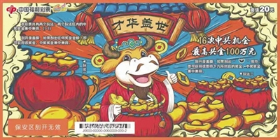 “才华盖世”以“国潮风”为主题,将传统文化与流行趋势完美结合。借助成语将彩票命名为“才华盖世”,寓意着“财华盖世”。票面采用“牛财神”作为主画面,巧妙迎合主题。该票共16次中奖机会,最高奖金100万元。