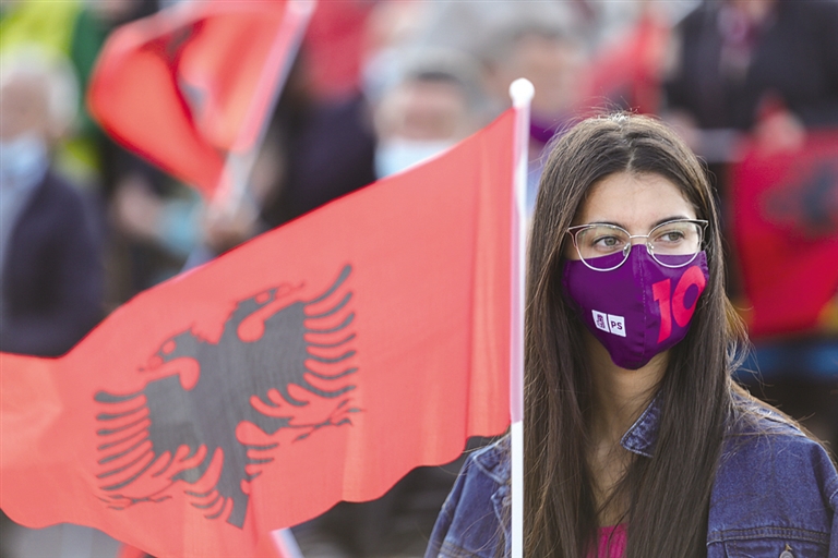 4月27日,阿尔巴尼亚社会党的支持者在首都地拉那集会。阿尔巴尼亚中央选举委员会28日宣布,执政的阿尔巴尼亚社会党在25日举行的议会选举中获胜,赢得第三个任期。(据新华社报道)