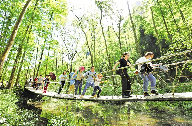 5月1日,游人在湖南省张家界市武陵源区金鞭溪景区游玩。五一小长假正值春夏之交,草木葱茏,万物并秀,美丽中国,尽收眼底。摄影/吴勇兵