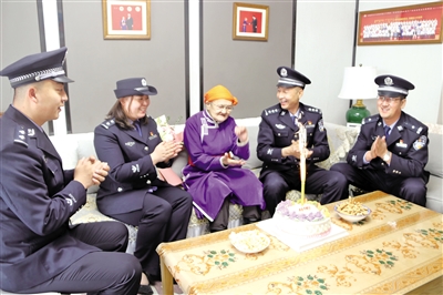 “额吉,祝您母亲节快乐!”民警们一进家门,便为都贵玛老人送上了鲜花和节日的祝福。民警们与都贵玛老人唠着家常,关切地询问老人的身体状况和生活情况。都贵玛老人动情地说:“现在的幸福生活是历届党和国家领导人带领全国各族人民共同奋斗的结果,我们身处这个伟大的新时代,一定要倍加珍惜!”