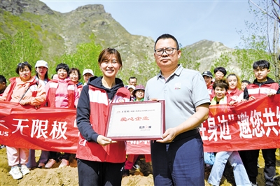 9年共耕耘,情洒读者林。如今的北方新报读者林已经初具规模,满山绿色。这一切,不是凭《北方新报》一己之力能做到的,园林部门、公交公司、原水泥厂以及广大读者和社会团体……大家都为播绿植绿贡献了自己的力量。为了感谢社会各界多年来对活动的支持,当天,《北方新报》特别向无限极(中国)内蒙古分公司颁发了“爱心企业”奖牌,向内蒙古高速广告传媒有限责任公司颁发了“植绿护绿最美团体”奖杯,向呼和浩特鹰翔水泥有限责任公司颁发了“护绿卫士”奖杯。