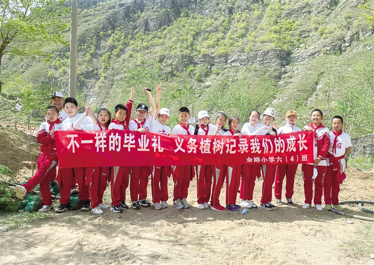 “妈妈,这里不一样啦!看,山上都绿了,比3年前我们第一次来时绿色更多了。”“我们当年植的树在哪儿,它长成什么样了?”一群少年沿着崎岖的山路上山,寻找3年前自己种植的小树。他们是呼和浩特市赛罕区金桥小学六年级(4)班的少先队员。2018年,当时还是三年级的他们积极响应本报第七次大型公益植树活动号召,在父母陪同下,第一次来到北方新报读者林,每人认领并种植了一棵小树苗。如今,即将小学毕业的他们再次在父母陪同下,故地重游,探望他们曾经种下的小树,挥锹种下新树苗,给自己一个充满仪式感的毕业礼。