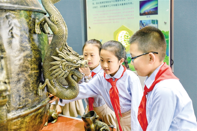 5月11日,学生们通过张衡地动仪演示装置了解抗震知识。当日,呼和浩特市玉泉区通顺街小学学生走进该区地震科普馆,通过参观展品、展板,体验虚拟场景等方式,了解地震相关知识,学习自救互助技能,提高应急避震的能力,迎接5月12日全国防灾减灾日的到来。