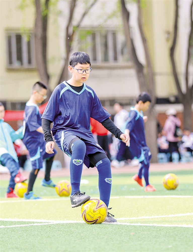 5月8日,锡林南路小学的足球小将在绿茵场上展示球技。据了解,为丰富校园体育活动的多样性,该校多年来发展的足球项目受到了学生的喜爱。