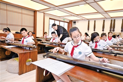 5月11日,福州市乌山小学学生在参加课后古琴兴趣班。近年来,福州市教育部门在全市义务教育阶段学校广泛开展学生课后服务,让学生足不出校就能学习篆刻、书法、古琴等传统文化课程。摄影/新华社记者 宋为伟
