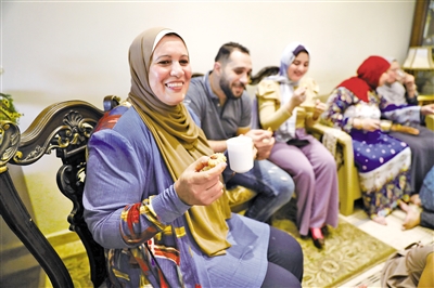 5月13日,人们在埃及开罗的家中品尝甜点,庆祝开斋节。受持续的新冠疫情影响,许多埃及民众选择居家庆祝开斋节。(据新华社报道)