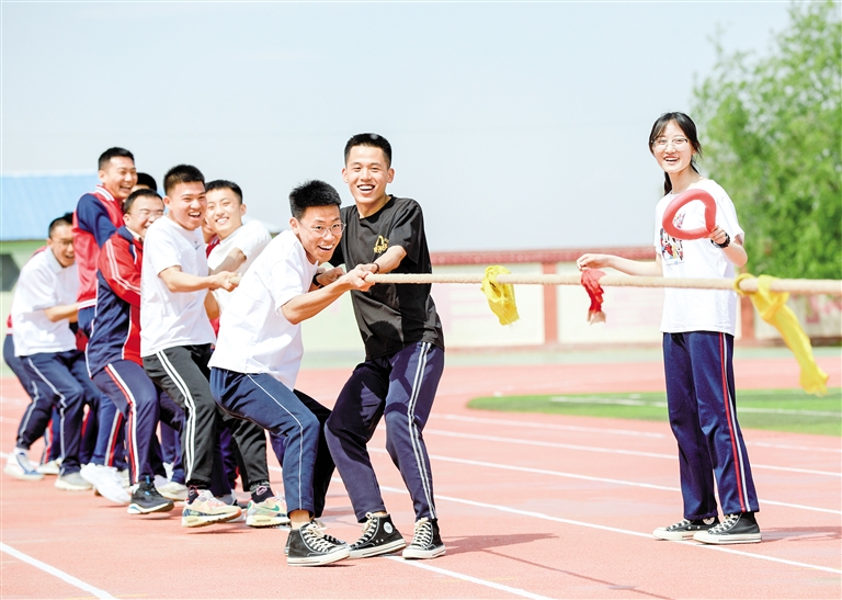 5月17日,呼和浩特市第十二中学高三学生在校内比赛拔河,现场欢笑声、呐喊声此起彼伏。高考临近,为帮助考生放松身心缓解心理压力,该校特开展双人协作夹球跑、滚铁圈、跳绳等趣味运动,让考生们以自信、乐观、平和的心态迎接高考。摄影/北方新报正北方网记者 牛天甲