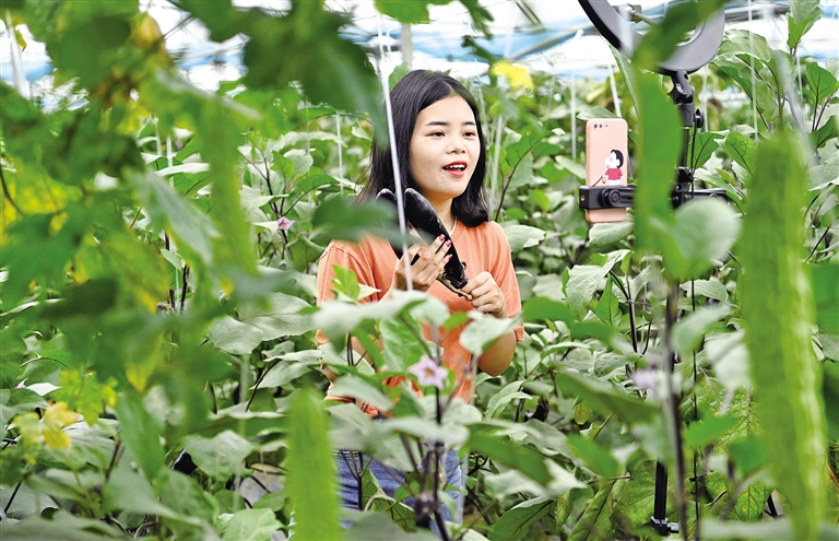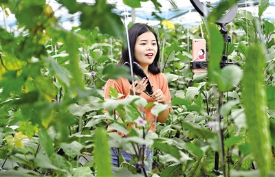 5月16日,鹤子镇阳佳村富硒产业基地主播郭燕婷在大棚里直播。近年来,江西省赣州市安远县大力发展电商产业,电商已成为当地农民增收致富的契机,手机成为广大农民的新农具,开网店、直播带货成为“新农活”。摄影/新华社记者 陶 明