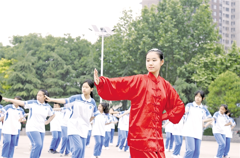 5月20日,邢台市第七中学学生在练习“五禽戏”。河北省邢台市第七中学开设“五禽戏”课程,通过教授“五禽戏”,培养学生积极健身的意识,传承非遗文化。摄影/张 驰