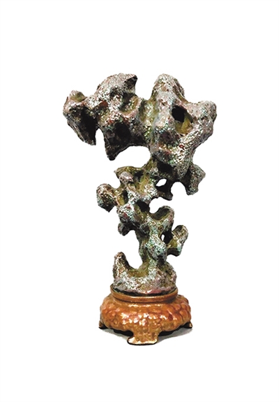 清乾隆年间陶瓷艺术繁盛,一些制瓷艺人“发思古之幽情”,将青铜器、香炉、竹雕、奇石等进行瓷化仿制。这件仿灵璧石摆件在形态、纹理、色泽以及神韵上都做到和真正的灵璧石一般无二,确实是需要耐心、功力和技巧的。(据《西安晚报》)