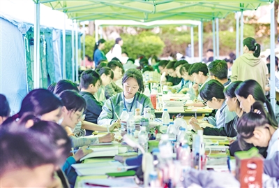 记者在这个特殊的“帐篷课堂”看到,学生们有的正在集中做着卷子,有的在复习课文,老师在一旁耐心讲解。远处,空置的教学楼悬挂着条幅,上面写着“用拼搏的汗水灌注无悔的高三路 考前不怕 考后不悔”。
